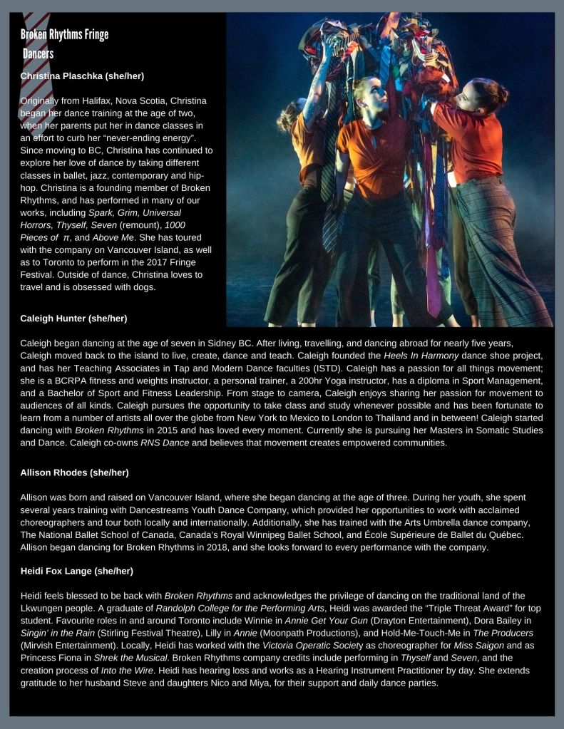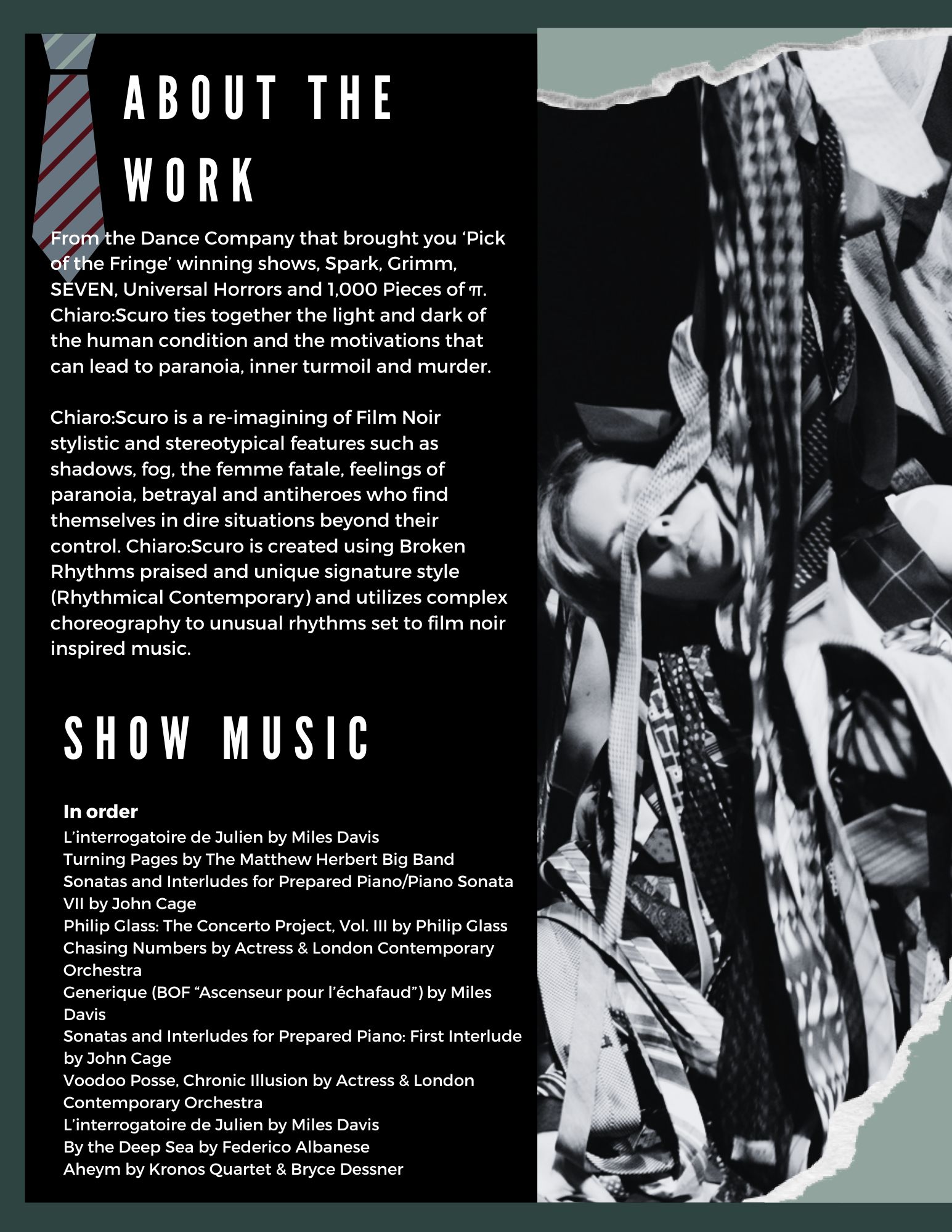 From the Dance Company that brought you ‘Pick of the Fringe’ winning shows, Spark, Grimm, SEVEN, Universal Horrors and 1,000 Pieces of π. Broken Rhythms is back at Victoria Fringe to wow audiences with an exceptional new work. Taking inspiration from the Film Noir genre and Germanic Expressionism, Chiaro:Scuro ties together the light and dark of the human condition and the motivations that can lead to paranoia, inner turmoil and murder.