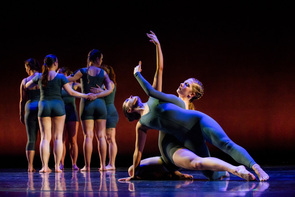 Early in the show, there is a trio set to music that vaguely resembles a dial tone (though far more pleasing to the ear). It seems to me that the dancers are pushing through the confines of stagnation, their bold, sharp, staccato movements reverberating past an invisible barrier that threatens to hold them in place. I love how their abrupt gestures pulse with passion and intention while simultaneously conveying a sense of limitation and repetition. This section is a pleasure to watch from the sidelines!