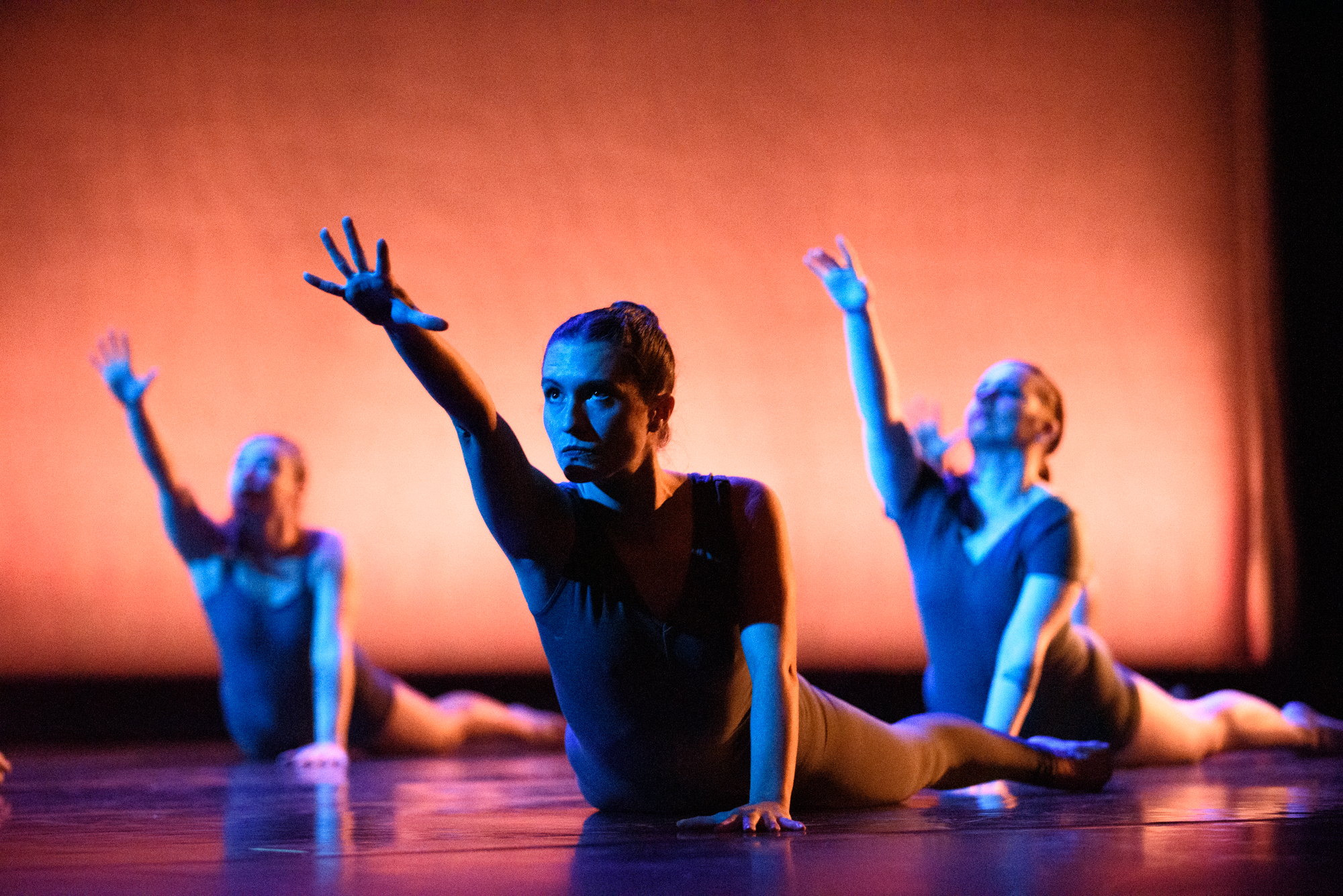 Early in the show, there is a trio set to music that vaguely resembles a dial tone (though far more pleasing to the ear). It seems to me that the dancers are pushing through the confines of stagnation, their bold, sharp, staccato movements reverberating past an invisible barrier that threatens to hold them in place. I love how their abrupt gestures pulse with passion and intention while simultaneously conveying a sense of limitation and repetition. This section is a pleasure to watch from the sidelines!